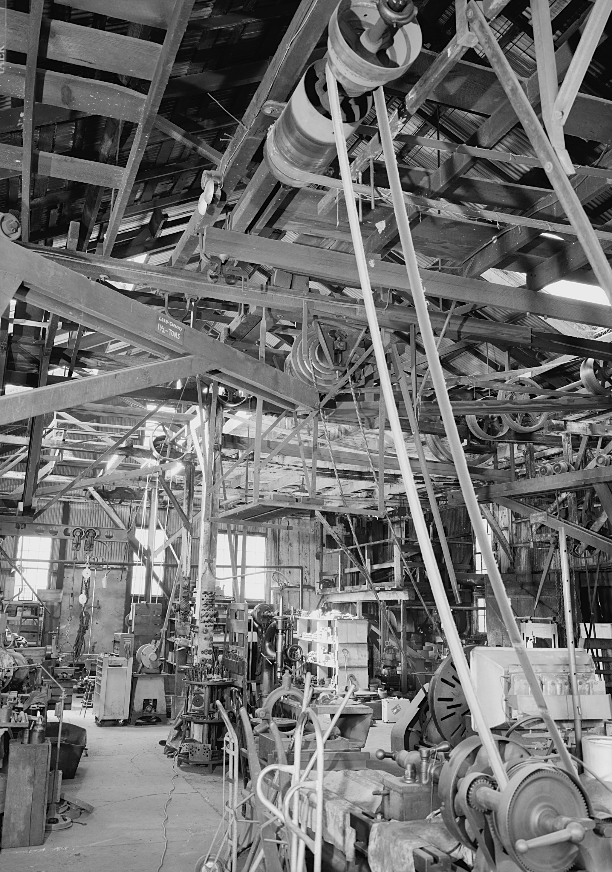 Belt-driven factory floor, circa 1900: one steam engine powers every machine through a maze of belts and pulleys. Replace the engine with an electric motor and nothing changes — same layout, same constraints, same bottlenecks.